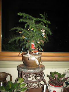 I don't know if you can tell but the tree has another upgrade.I was in-----Wally World today. I know I know- I was supporting the beast- and I bought lights for the tree.
